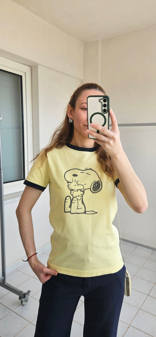 Kolları ve Yakası Lacivert Lastikli Üç İplik Sarı Tshirt
