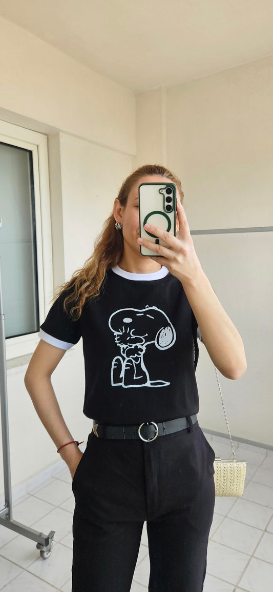 Kolları ve Yakası Beyaz Lastikli Üç İplik Siyah Tshirt