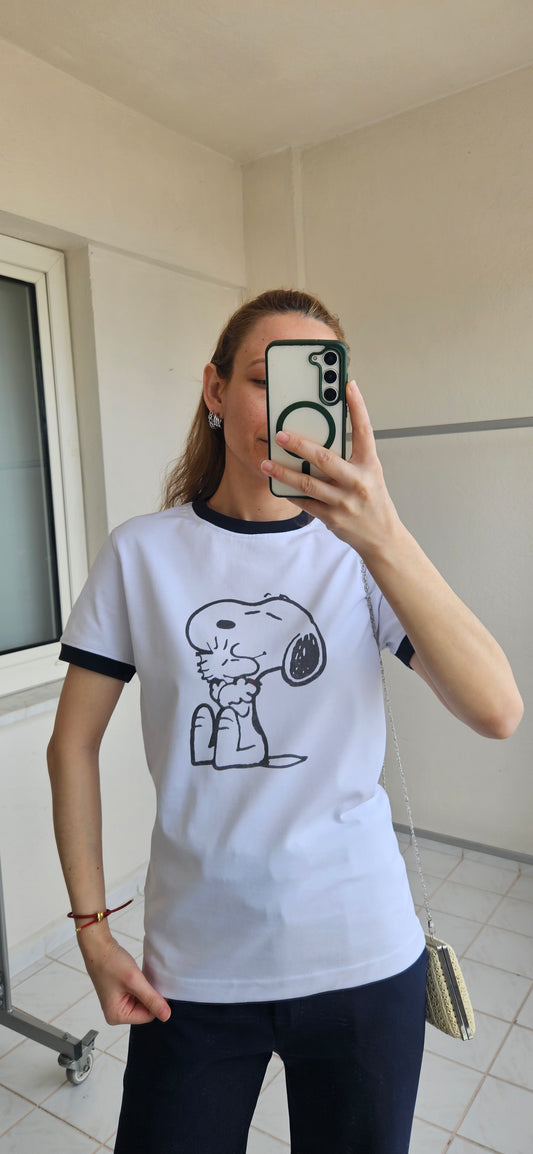 Kolları ve Yakası Lacivert Lastikli Üç İplik Beyaz Tshirt