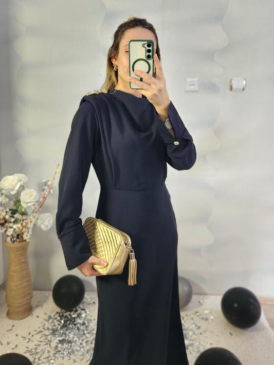 Tek Omzu ve Kolları Gold Düğmeli Vatkalı Lacivert Elbise