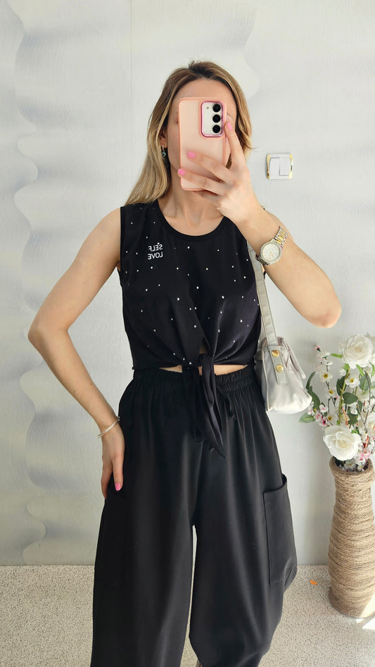 Önü Bağlamalı Üzeri Taşlı Pamuk Kumaş Siyah Crop