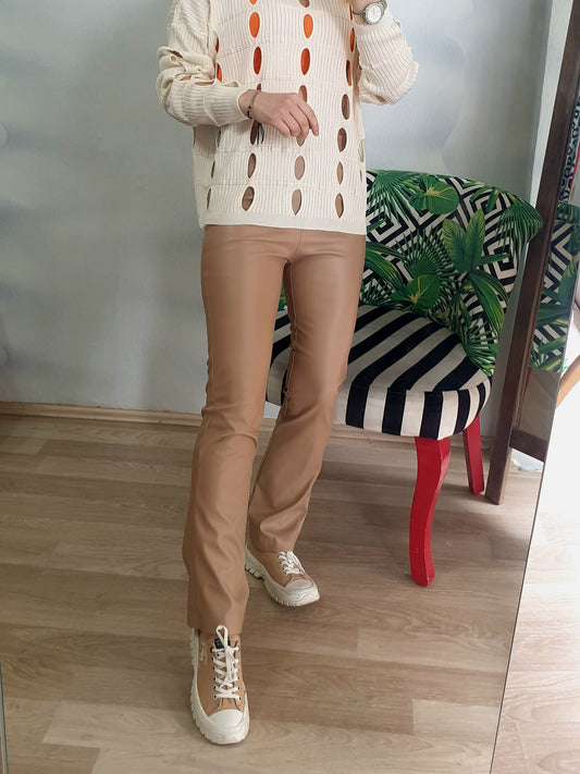 Yandan Fermuarlı Şardonlu Flora Deri Pantolon