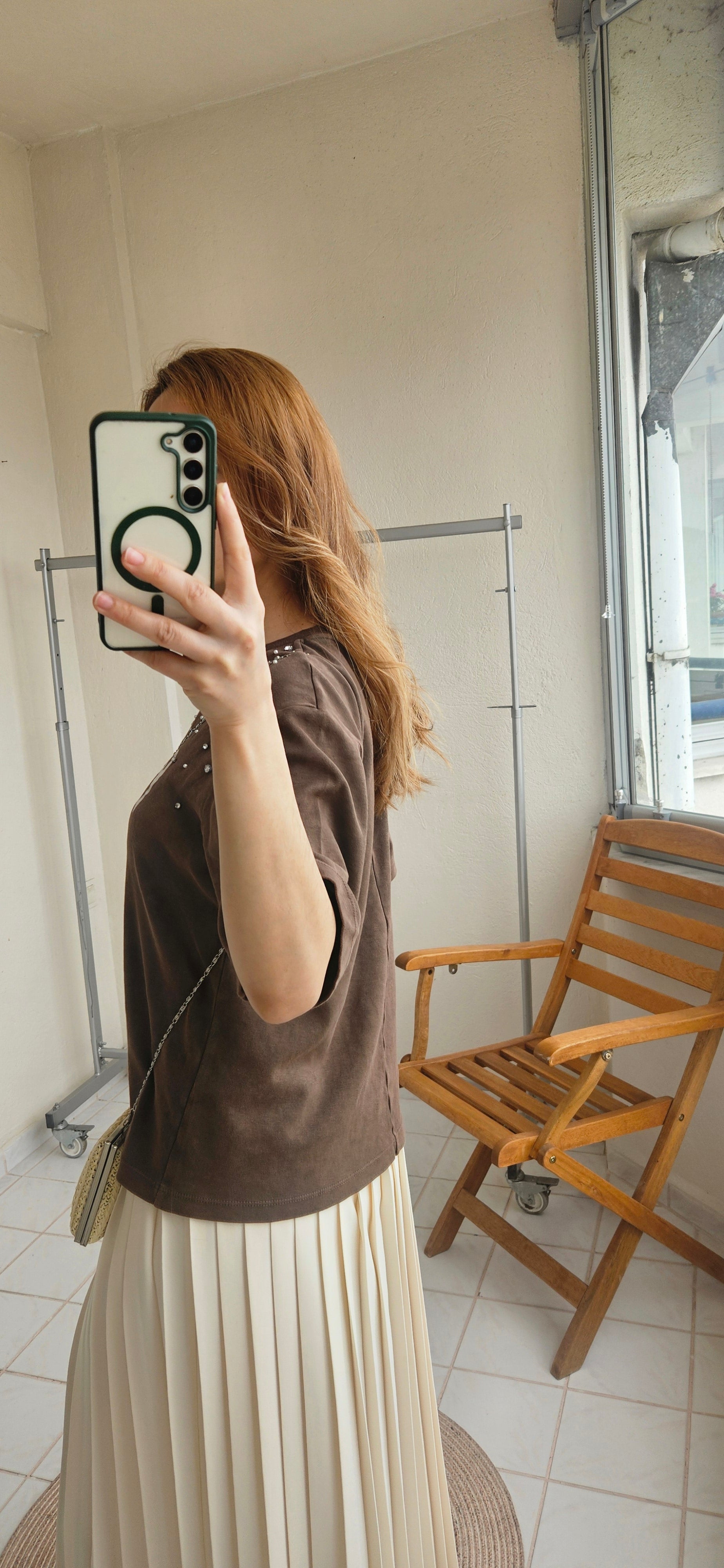 Yıkamalı Taşlı ve Baskılı Kahve Tshirt