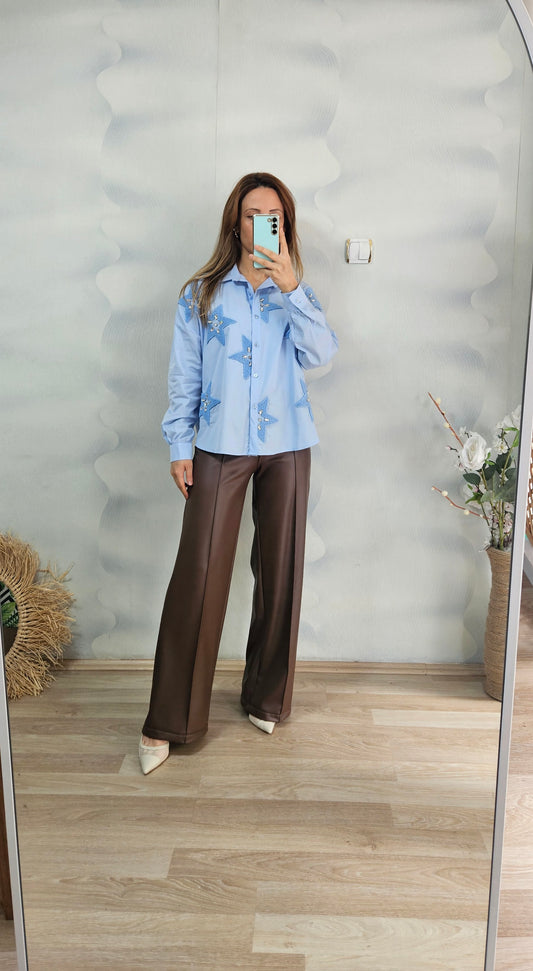 Yıldız Kabartmalı ve Taşlı Mavi Poplin Kumaş Gömlek