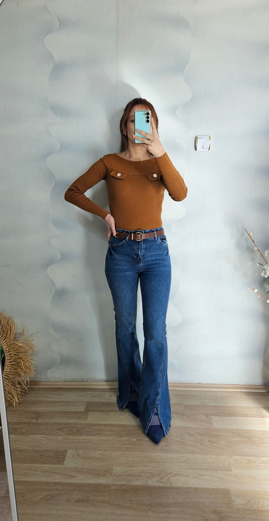 Kemer Boy Gold Düğme Detaylı Taba Renk Badi